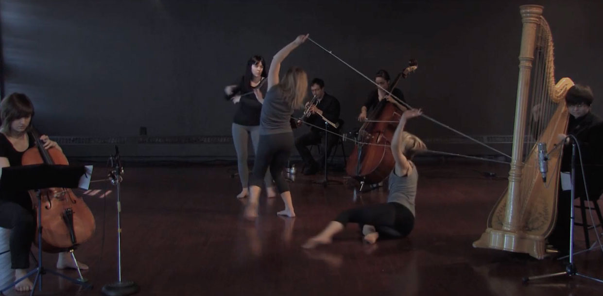 Strings stretched across the performance space and threaded into a double bass and harp are operated by dancers who generate elements of the music that perpetuates their motion. This motion bows the harp and double bass, producing unique sounds that the musicians could not produce independently. The strings become a catalyst for sound and motion creating, a visual and spatial connection between the musicians, dancers and performance venue.