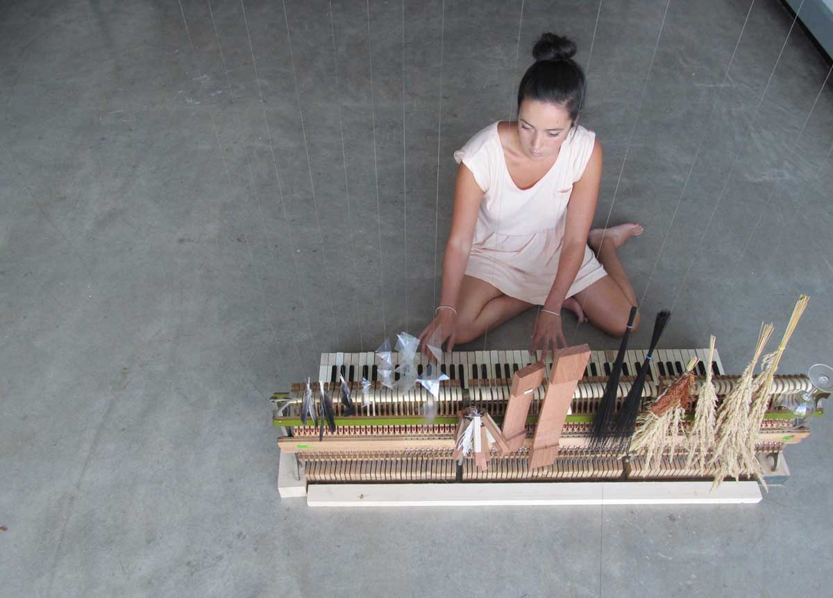 The moving mechanism of an acoustic upright piano is extracted and placed on the floor to operate on a selection of sounding materials. Feathers, wheat stalks, glass jars and tuned wood scraps become a palette for evoking a sense of place, recalling a memory or a dream through sound.
